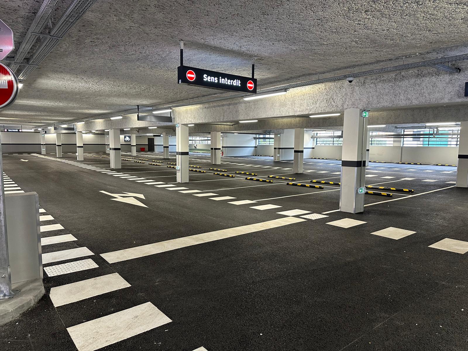 Le parking couvert du Lidl de La Roseraie, éclairé et signalé pour sécuriser les flux de véhicules et piétons.